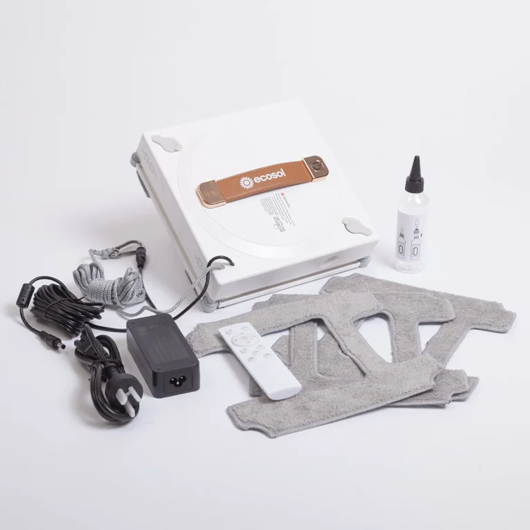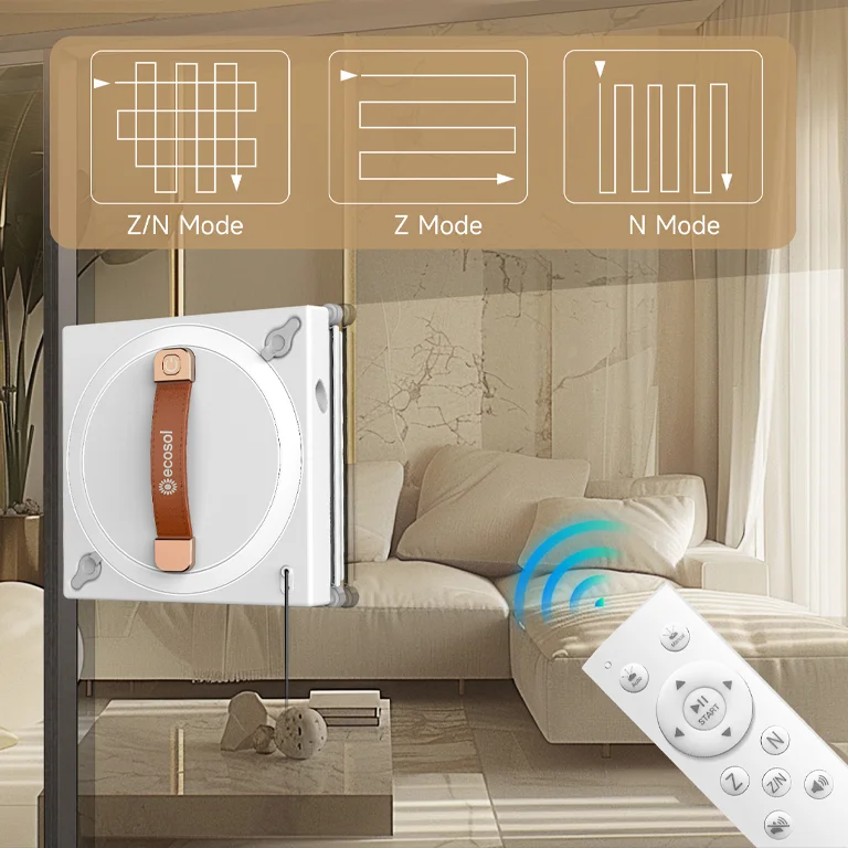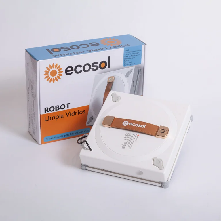 Robot Limpia Vidrios Inteligente Ecosol de alto nivel completamente automático con inteligencia artificial capaz de planificar rutas y bordes de forma eficiente. Incorpora un sistema de detección y limpieza automática que cubre toda la superficie de la ventana. Equipado con dos boquillas rociadoras bidireccionales para una limpieza óptima y un motor de vacío que le permite adherirse y moverse libremente sobre superficies de vidrio verticales.